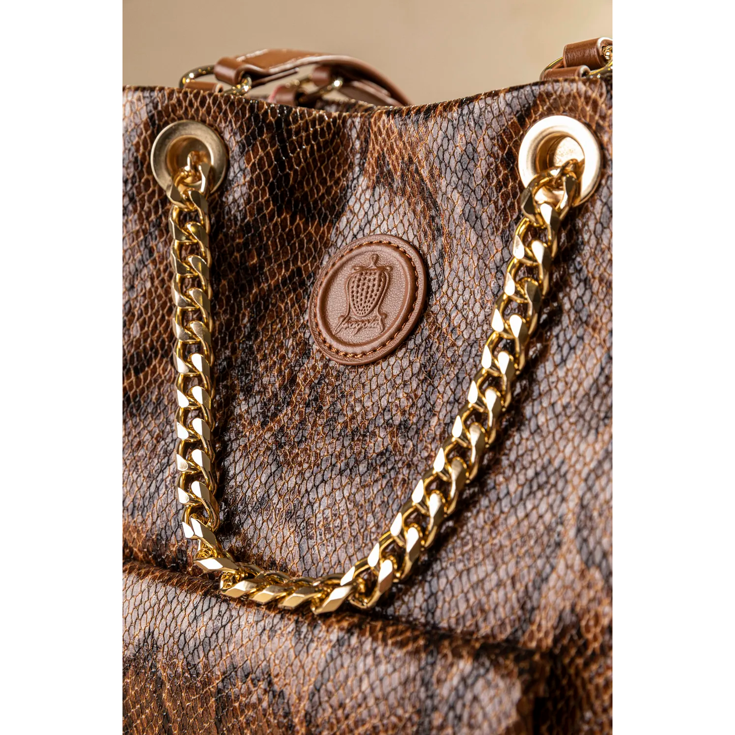 Μια πανάλαφρη τσάντα ώμου και χερός που κλείνει με μαγνητικό button. Διαθέτει "χεράκια" δερματίνης για τον ώμο αλλά και κοντές αλυσίδες για κράτημα στο χέρι αλλά και για έξτρα στιλ. Στο μπροστά μέρος της διαθέτει τσεπάκι που κλείνει με μεταλλική κλειδαριά. Ένας ενιαίος χώρος εσωτερικά που διαθέτει όλα τα κλασικά μικροτσεπάκια με φερμουάρ και χωρίς. Με έξυπνη αυξομείωση του φάρδους της τσάντας από τα πλαινά της μέρη. Υλικό: Συνθετικό δέρμα με υφή και print φιδιού και tiger print.