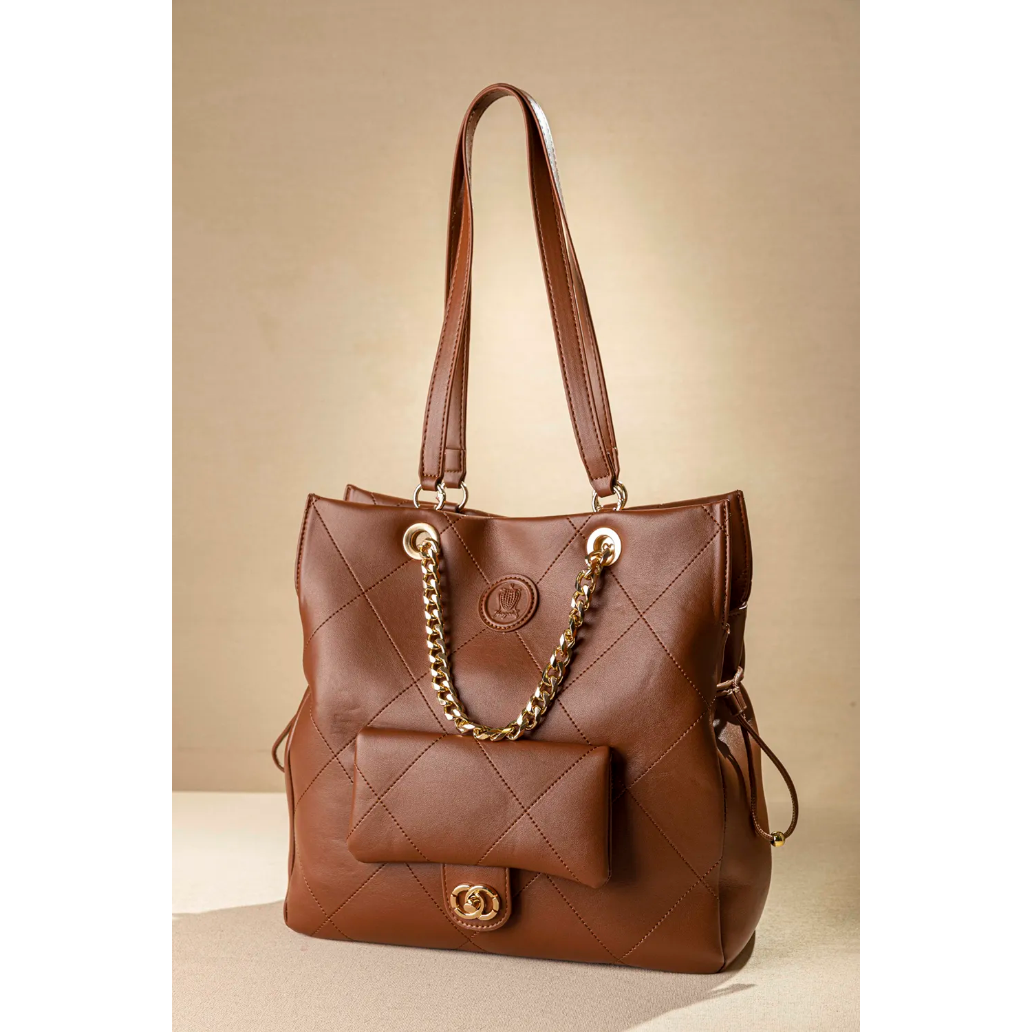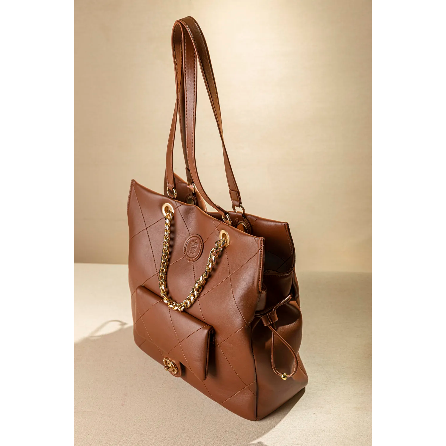 Μια πανάλαφρη τσάντα ώμου και χεiρός που κλείνει με μαγνητικό button. Διαθέτει "χεράκια" δερματίνης για τον ώμο αλλά και κοντές αλυσίδες για κράτημα στο χέρι αλλά και για έξτρα στιλ. Στο μπροστά μέρος της διαθέτει τσεπάκι που κλείνει με μεταλλική κλειδαριά. Ένας ενιαίος χώρος εσωτερικά που διαθέτει όλα τα κλασικά μικροτσεπάκια με φερμουάρ και χωρίς. Με έξυπνη αυξομείωση του φάρδους της τσάντας από τα πλαινά της μέρη. Υλικό: Συνθετικό δέρμα με μαλακή υφή και γαζιά.