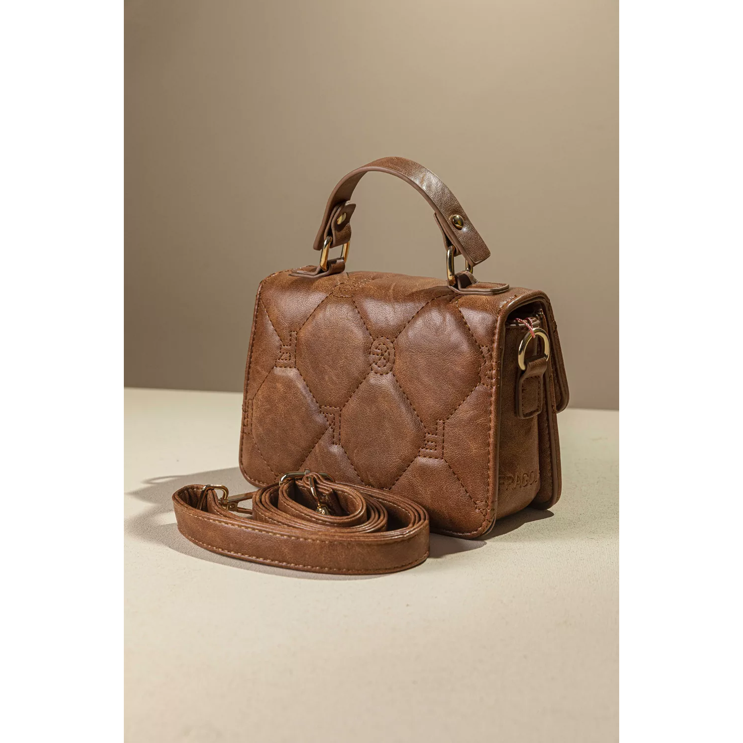 Υλικό: Μαλακό συνθετικό δέρμα με παλαιωμένη όψη και καπιτονέ γαζιά που απεικονίζουν τα γράμματα της εταιρείας.