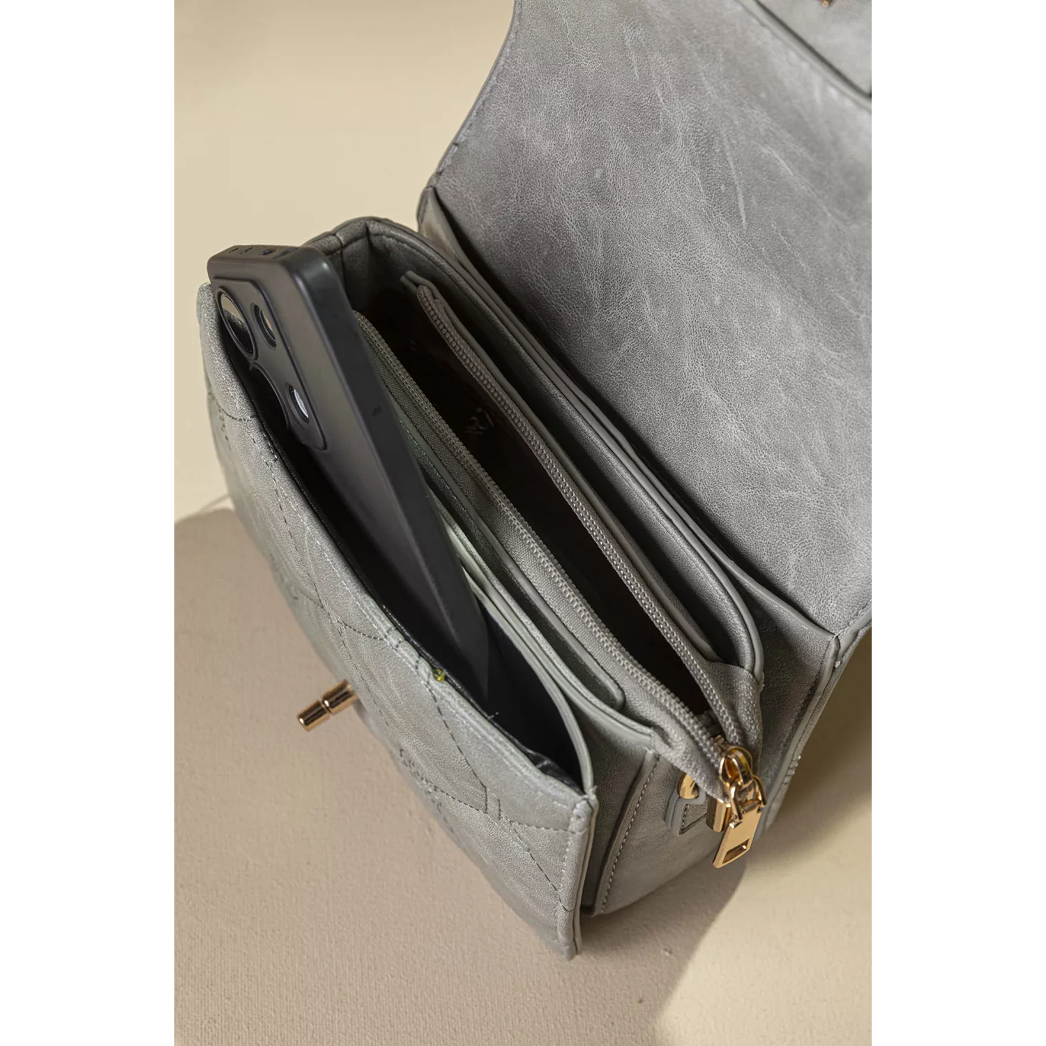 • Τριθέσια κομψή τσάντα χειρός με καπιτονέ υφή και χρυσό εντυπωσιακό κλείσιμο. • Εκτός από το κοντό πτυσσόμενο χέρι περιλαμβάνει μακρύ χέρι για χιαστί κράτημα. • Ιδανική για chic καθημερινές και βραδινές εμφανίσεις. Υλικό: Μαλακό συνθετικό δέρμα με παλαιωμένη όψη και καπιτονέ γαζιά που απεικονίζουν τα γράμματα της εταιρείας.