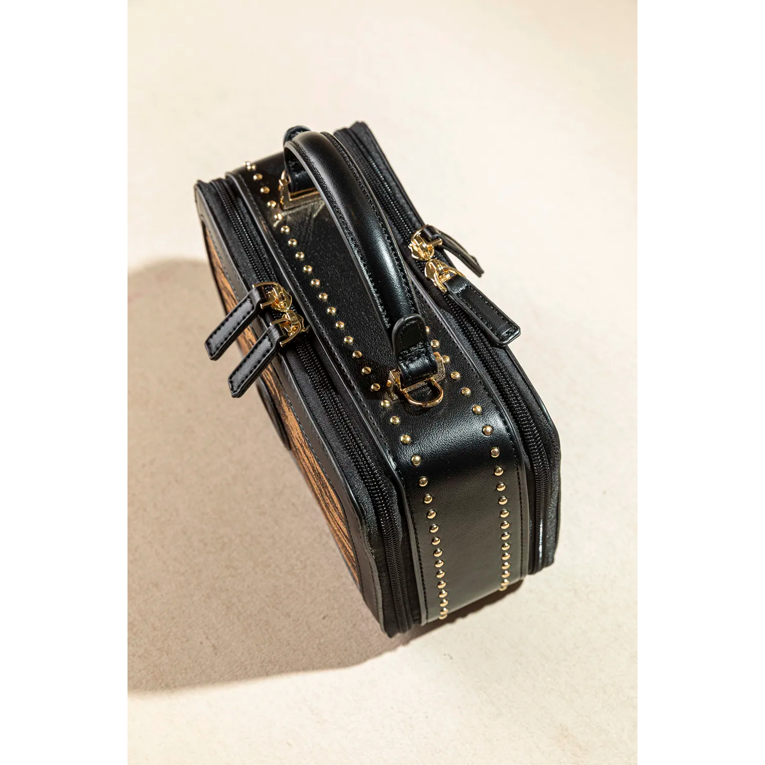 Ορθογώνιο Καπιτονέ βαλιτσάκι χειρός αλλά και χιαστί με στρογγυλεμένες άκρες που ταιριάζει σε βραδινές αλλά και casual εμφανίσεις. Δυο διαφορετικές θέσεις με αρκετό χώρο στο εσωτερικό τους για όλα τα απαιτούμενα για τη βόλτα σας! Μικρά τσεπάκια στην εσωτερική φόδρα για τα μικροαντικείμενά σας. Τρουκς περιμετρικά δίνουν μια rock διάθεση στην τσάντα! Διαθέτει έξτρα "χεράκι" που το μετατρέπει σε χιαστί. Υλικό: Μαλακό Συνθετικό δέρμα με tiger print.