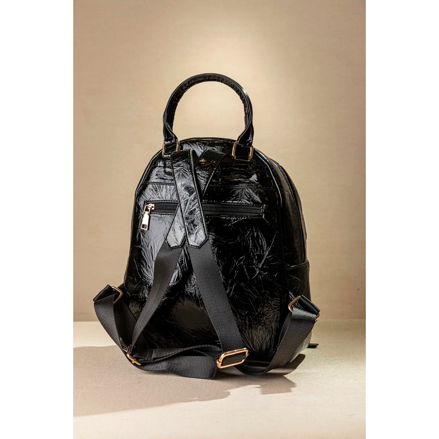 Μεγάλο μαλακό backpack για κάθε μέρα! Ένας ενιαίος χώρος εσωτερικά και όλα τα απαραίτητα τσεπάκια με και χωρίς φερμουάρ, για τα μικροαντικείμενά σας! Μπροστά εξωτερικά δύο μικρά τσεπάκια με φερμουάρ και μια μεγαλύτερη θήκη που κλείνει με καπάκι με μεταλλική κλειδαριά. Στο πίσω εξωτερικό μέρος της τσάντας έξτρα τσέπη με φερμουάρ. Υλικό: Μαλακό συνθετικό δέρμα με γαζιά.