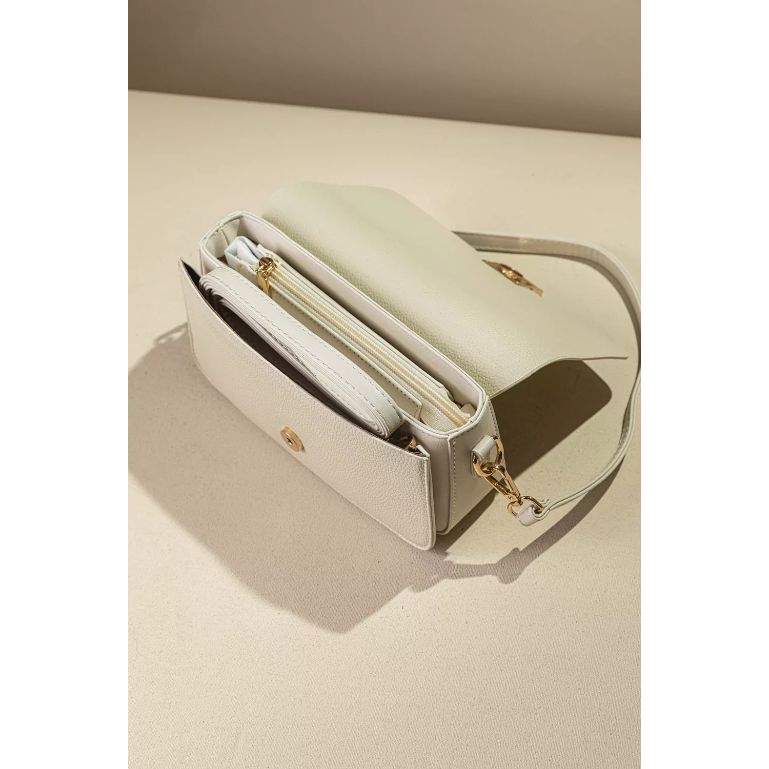 • Κομψή γυναικεία τσάντα σε minimal γραμμή και διαχρονικό σχεδιασμό. Είναι διθέσια προσφέροντας πρακτική οργάνωση για τα καθημερινά σας απαραίτητα. • Διαθέτει κλείσιμο με φερμουάρ για μεγαλύτερη ασφάλεια, το οποίο καλύπτεται διακριτικά κάτω από το καπάκι, συνδυάζοντας λειτουργικότητα και στυλ. • Κατασκευασμένη από υψηλής ποιότητας υλικό με διακριτική ανάγλυφη υφή, που προσδίδει διαχρονική αισθητική και αντοχή. • Το μεταλλικό κούμπωμα σε χρυσό τόνο προσθέτει μια elegant πινελιά. Τα δυο αποσπόμενα "αυτάκια" ένα για ώμο ένα για χιαστί, επιτρέπουν ευέλικτη εφαρμογή. • Μια ευέλικτη επιλογή που συνδυάζει στυλ και πρακτικότητα, ιδανική για όλες τις ώρες της ημέρας.