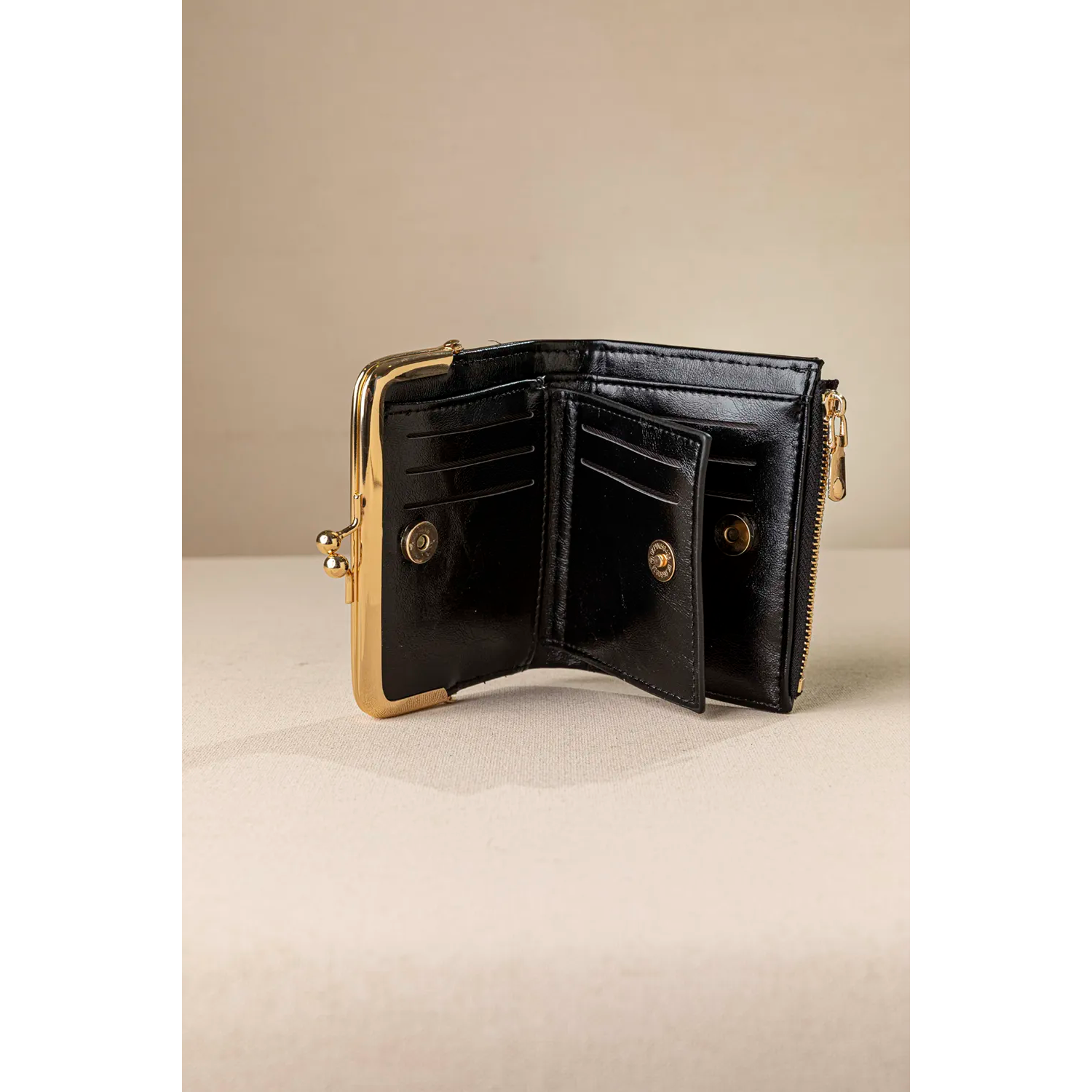 Μικρό elegant πορτοφόλι με πολλές θήκες για κάρτες. Διπλός χώρος για κάρτες εσωτερικά που κλείνει με μαγνητικό button και φυσικά θήκη για χαρτονομίσματα. Η κερματοθήκη του έχει μεταλλικό vintage κλείσιμο και διαθέτει έξτρα θήκη που κλείνει με μεταλλικό φερμουάρ.