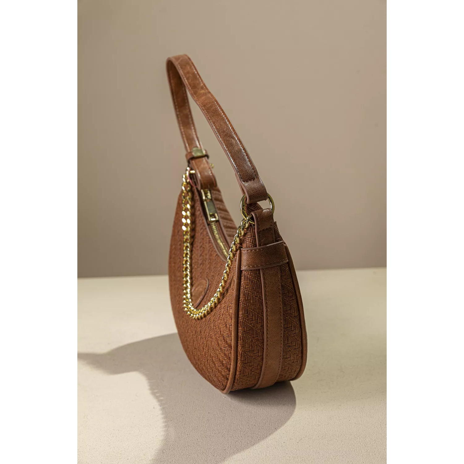 • Νεανική διαχρονική τσάντα ώμου, ιδανική για κάθε ώρα της ημέρας. • Διακοσμείται με εντυπωσιακή χρυσή αλυσίδα στο μπροστινό μέρος καθώς και συνθετικό ανάγλυφο δέρμα με το logo της εταιρείας. • Διαθέτει ρυθμιζόμενο χέρι ώμου για άνετη εφαρμογή και πρακτικό μέγεθος που χωράει τα απαραίτητα της καθημερινότητας. • Κλείνει με φερμουάρ για μεγαλύτερη ασφάλεια και έχει εσωτερικά όλα τα απαραίτητα τσεπάκια. • Συνδυάζεται εύκολο τόσο με casual όσο και με πιο chic εμφανίσεις. Υλικό: Συνθετικό δέρμα με υφή ψάθας σε γήινα χρώματα ή συνθετικό ανάγλυφο δέρμα που απεικονίζουν τα γράμματα της εταιρείας.