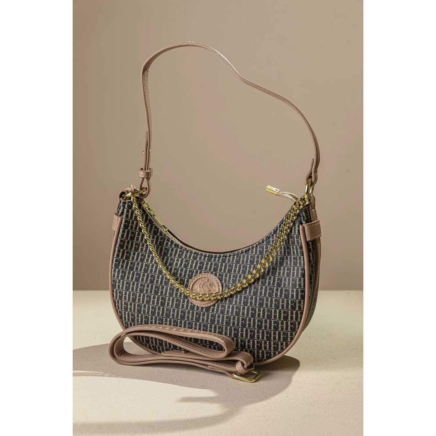 • Νεανική διαχρονική τσάντα ώμου, ιδανική για κάθε ώρα της ημέρας. • Διακοσμείται με εντυπωσιακή χρυσή αλυσίδα στο μπροστινό μέρος καθώς και συνθετικό ανάγλυφο δέρμα με το logo της εταιρείας. • Διαθέτει ρυθμιζόμενο χέρι ώμου για άνετη εφαρμογή και πρακτικό μέγεθος που χωράει τα απαραίτητα της καθημερινότητας. • Κλείνει με φερμουάρ για μεγαλύτερη ασφάλεια και έχει εσωτερικά όλα τα απαραίτητα τσεπάκια. • Συνδυάζεται εύκολο τόσο με casual όσο και με πιο chic εμφανίσεις. Υλικό: Συνθετικό δέρμα με υφή ψάθας σε γήινα χρώματα ή συνθετικό ανάγλυφο δέρμα που απεικονίζουν τα γράμματα της εταιρείας.