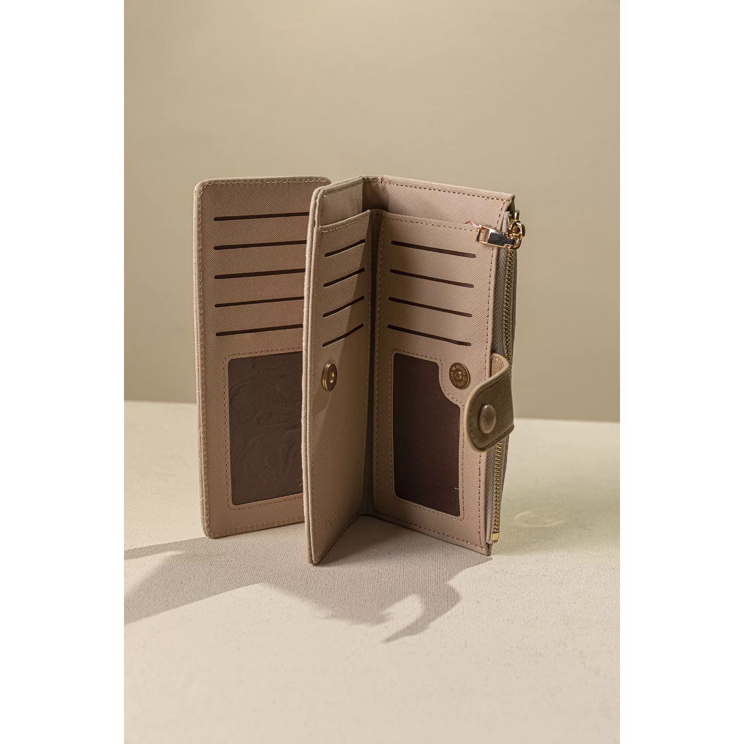 • Κομψό και πρακτικό γυναικείο πορτοφόλι, με διακριτικό ανάγλυφο σχέδιο στο εξωτερικό. • Κλείνει με γλώσσα και μπουτόν για μεγαλύτερη ασφάλεια, ενώ διαθέτει και ανεξάρτητη θήκη με φερμουάρ για κέρματα. • Το διπλό εσωτερικό του προσφέρει άνετη οργάνωση με πολλαπλές θήκες για κάρτες, διαφανής θέσεις για ταυτότητα ή φωτογραφία, καθώς και χώρους για χαρτονομίσματα και αποδείξεις. • Το πρακτικό μεγάλο μέγεθος το καθιστά ιδανικό για καθημερινή χρήση χωρώντας εύκολα σε κάθε τσάντα. Υλικό: Συνθετικό δέρμα με υφή canva και ανάγλυφο print.