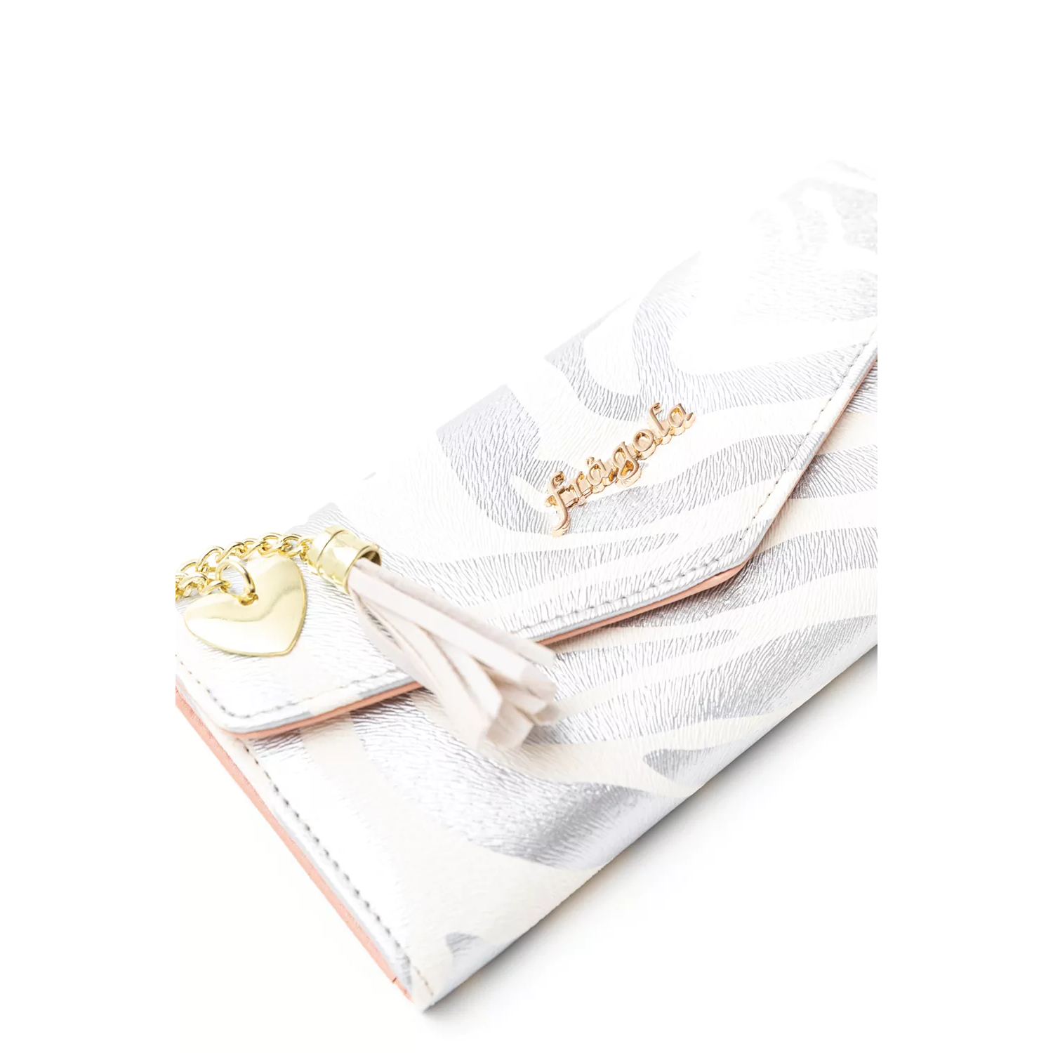 Πορτοφόλι φάκελος με εσωτερική τσέπη με φερμουάρ για τα κέρματα. Θέσεις χαρτονομισμάτων, καρτών και διαφόρων εγγράφων. Κλείνει με σούστα. Οι διακοσμητικές λεπτομέρειες με τη φούντα από το υλικό του πορτοφολιού αλλά και τη μεταλλική καρδούλα το κάνουν χαριτωμένο και ξεχωριστό. Υλικό: Συνθετικό δέρμα