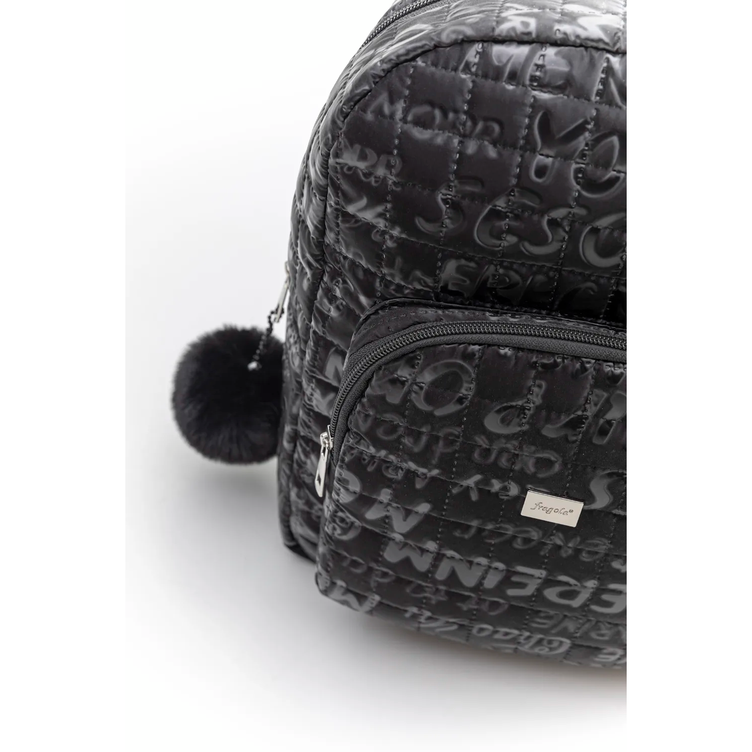 Puffer σακίδιο με γράμματα για όλες τις ηλικίες. Στο μπροστινό εξωτερικό μέρος υπάρχει μεγάλη βοηθητική τσέπη με φερμουάρ. Κλείσιμο με φερμουάρ και ιδιαίτερο γούνινο τελείωμα. Υλικό: puffer αδιάβροχο