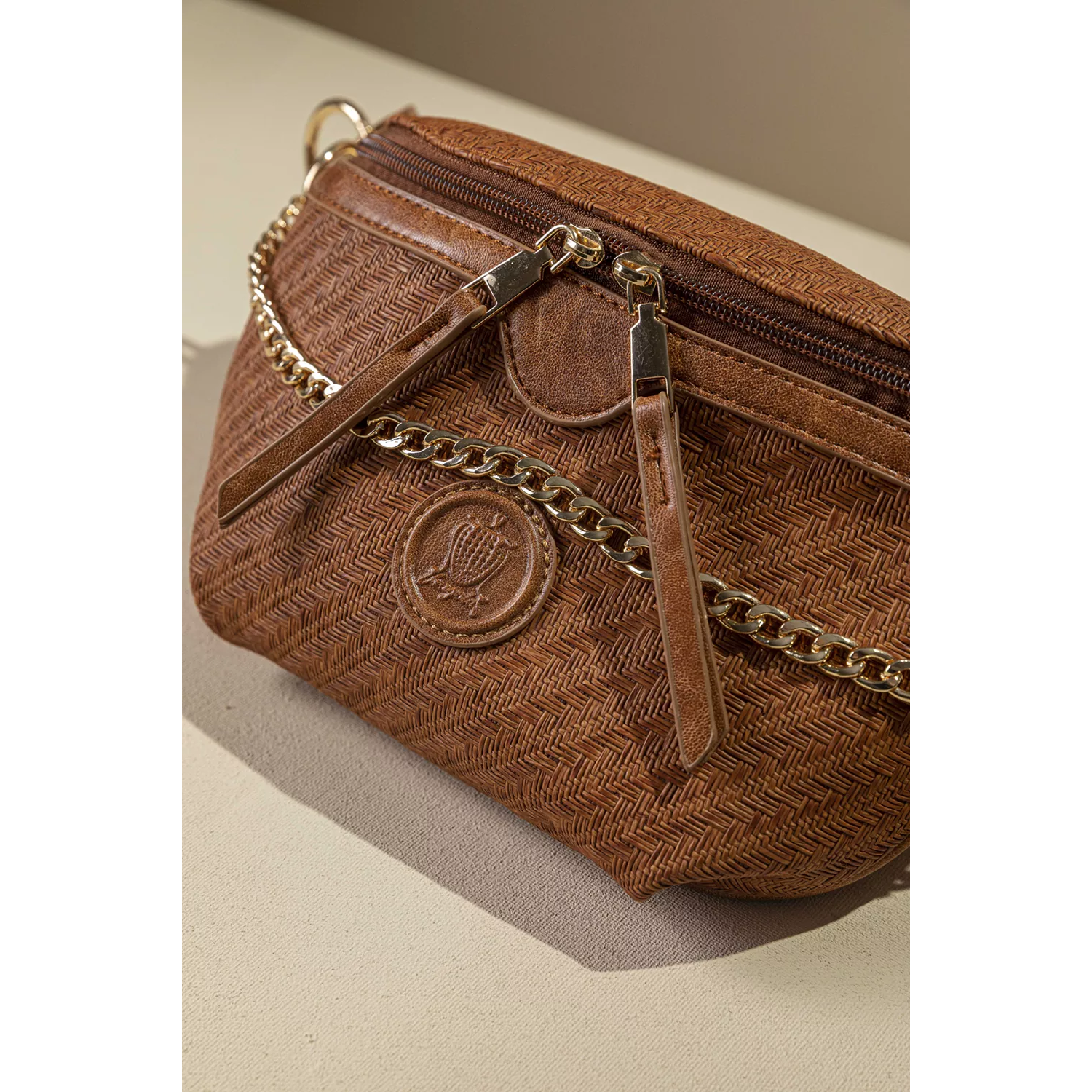 • Crossbody μεσαίου μεγέθους. Στην κεντρική θέση διαθέτει τα κλασικά τσεπάκια στη φόδρα. Προσαρμογή στη μέση ή στον ώμο. • Μονόχρωμος ιμάντας με δυνατότητα αυξομείωσης. Εντυπωσιακά pullers ίδια με το υλικό του φινιρίσματος για εύκολο άνοιγμα! • Η τροχισμένη αλυσίδα στο μπροστινό της μέρος δίνει μια πιο elegant πινελιά, όμως ταυτόχρονα είναι και αποσπώμενη. Υλικό: Συνθετική δερματίνη με μορφη ψάθας σε γήινες αποχρώσεις