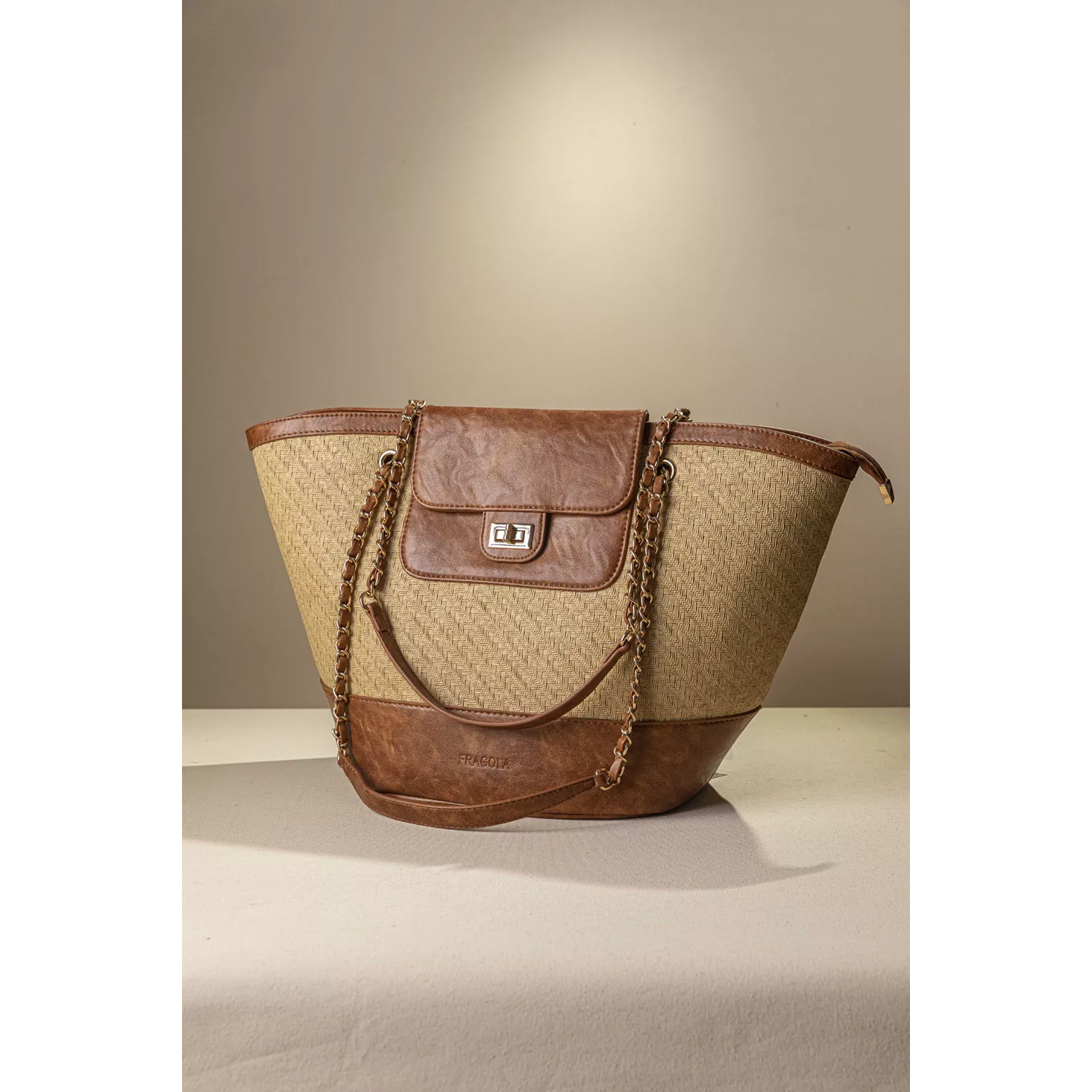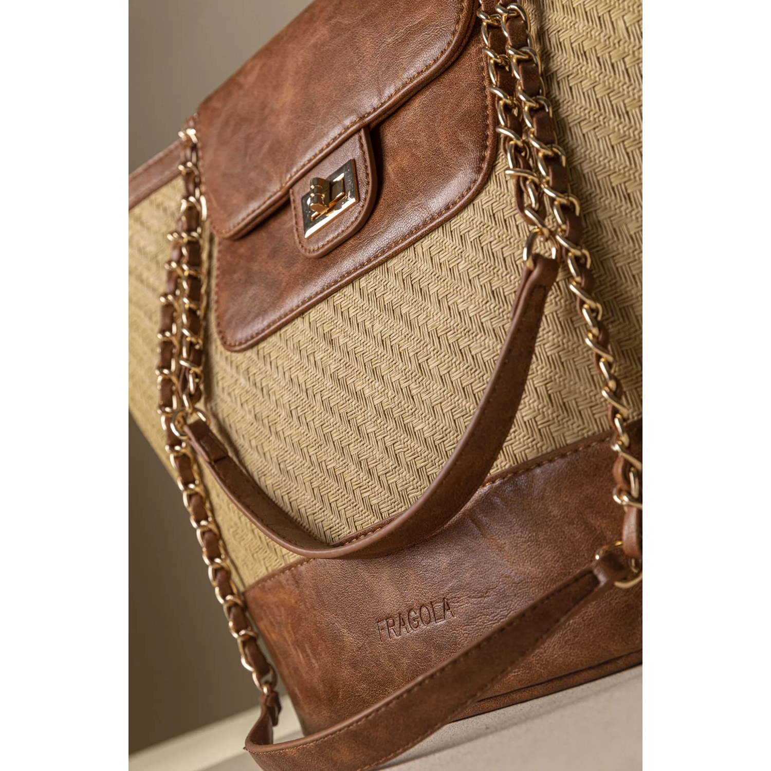 • Shopper τσάντα ώμου κατασκευασμένη από μαλακό συνθετικό δέρμα με υφή ψάθας. • Χρυσές μεταλλικές λεπτομέρειες που χαρίζουν πολυτελή εμφάνιση. Τσεπάκι με καπάκι και μεταλλικό κούμπωμα στο μπροστινό μέρος. • Οι διπλές αλυσίδες ώμου με επένδυση δέρματος προσφέρουν άνεση και σταθερό κράτημα. • Το ευρύχωρο εσωτερικό της είναι ιδανικό για καθημερινή χρήση απο το πρωί έως το βράδυ. Υλικό: Συνθετικό δέρμα με υφή ψάθας σε γήινες αποχρώσεις.