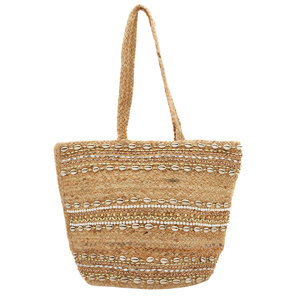 Τσάντα ώμου χειροποίητη από γιούτα διακοσμημέμη με κοχύλια και μεταλλικά στοιχεία (50Χ38Χ31) σε χρώμα μπέζ