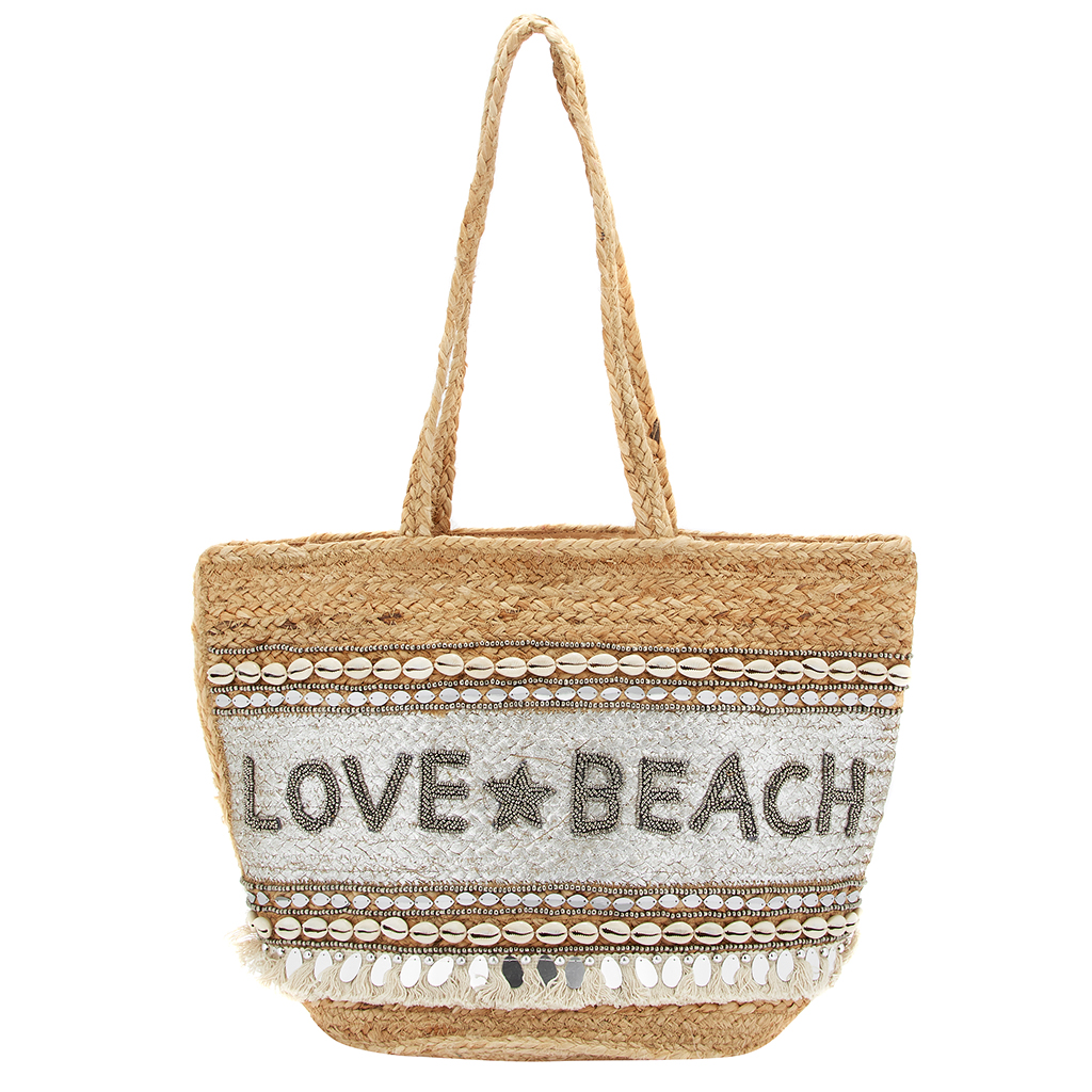 Τσάντα ώμου xειροποίητη από γιούτα διακοσμημένη με κοxύλια και μεταλλικές xάνδρες 'LOVE BEACH' 51x35x31cm σε xρώμα ασημί