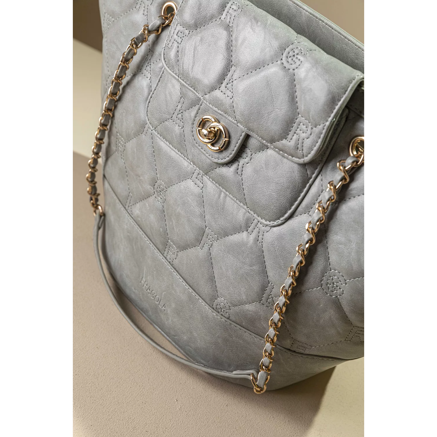 • Shopper τσάντα ώμου κατασκευασμένη από μαλακό συνθετικό δέρμα με παλαιωμένη όψη. • Καπιτονέ σχέδιο με γαζιά που απεικονίζει τα γράμματα της εταιρείας. Χρυσές μεταλλικές λεπτομέρειες που χαρίζουν πολυτελή εμφάνιση. • Τσεπάκι με καπάκι και μεταλλικό κούμπωμα στο μπροστινό μέρος. Οι διπλές αλυσίδες ώμου με επένδυση δέρματος προσφέρουν άνεση και σταθερό κράτημα. • Το ευρύχωρο εσωτερικό της είναι ιδανικό για καθημερινή χρήση απο το πρωί έως το βράδυ.