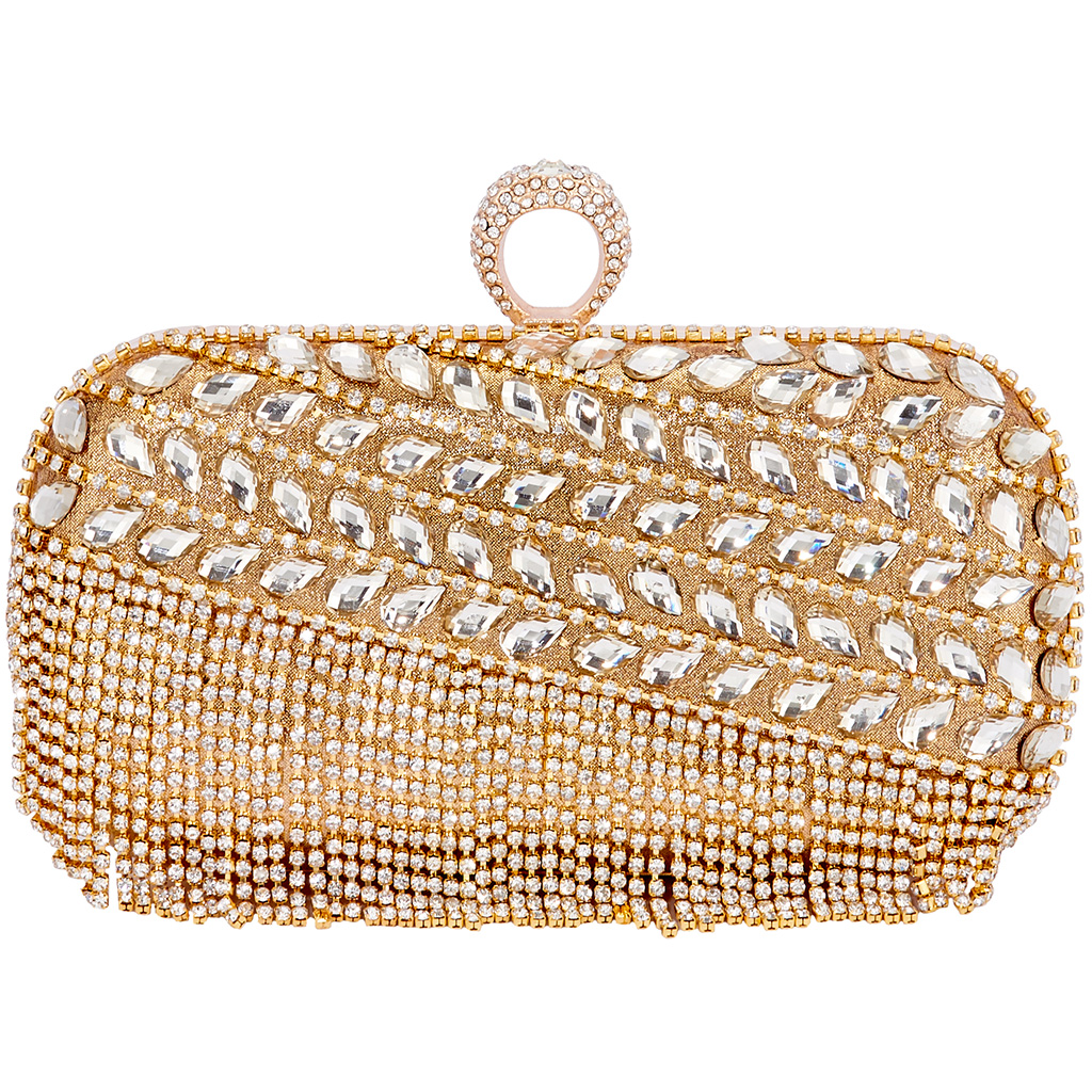 Τσαντάκι clutch με κρύσταλλα και ιδιαίτερο κούμπωμα "δαxτυλίδι" 19x11x4,5cm σε xρώμα xρυσό