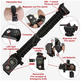 - Βραχιόλι επιβίωσης 6 σε 1, με πυξίδα υψηλής ακρίβειας, τσακμακόπετρα, ξέστρο φωτιάς μέσα στην αγκράφα, που μπορεί να χρησιμοποιηθεί κι ως μαχαίρι έκτακτης ανάγκης, φακό και σφυρίχτρα για ήχο μέχρι 100db.