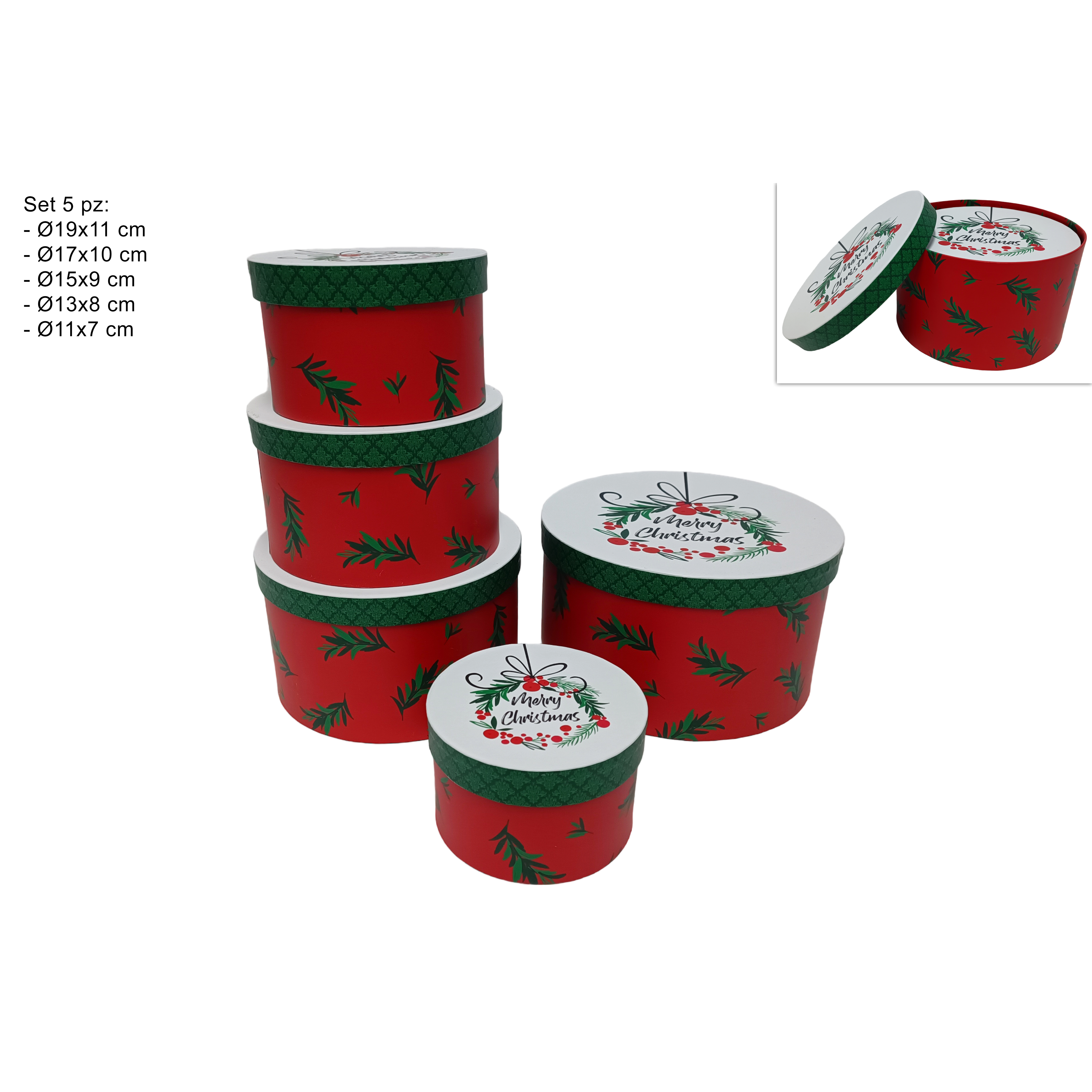 Χριστουγεννιάτικα κουτιά στρόγγυλα σε κόκκινο χρώμα σετ 5τμχ