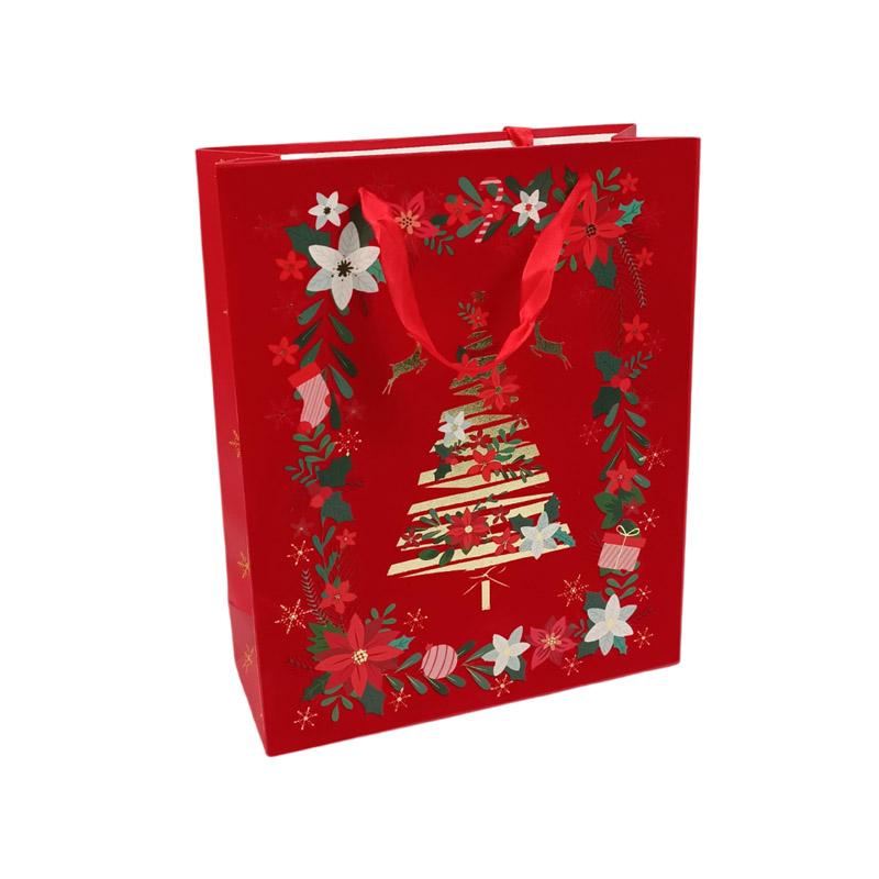 Χριστουγεννιάτικη σακούλα δώρου με χρυσαφί διακόσμηση με διαστάσεις 32x26x10cm σε βελουτέ κόκκινο χρώμα