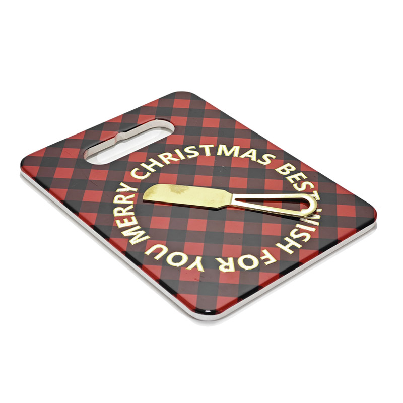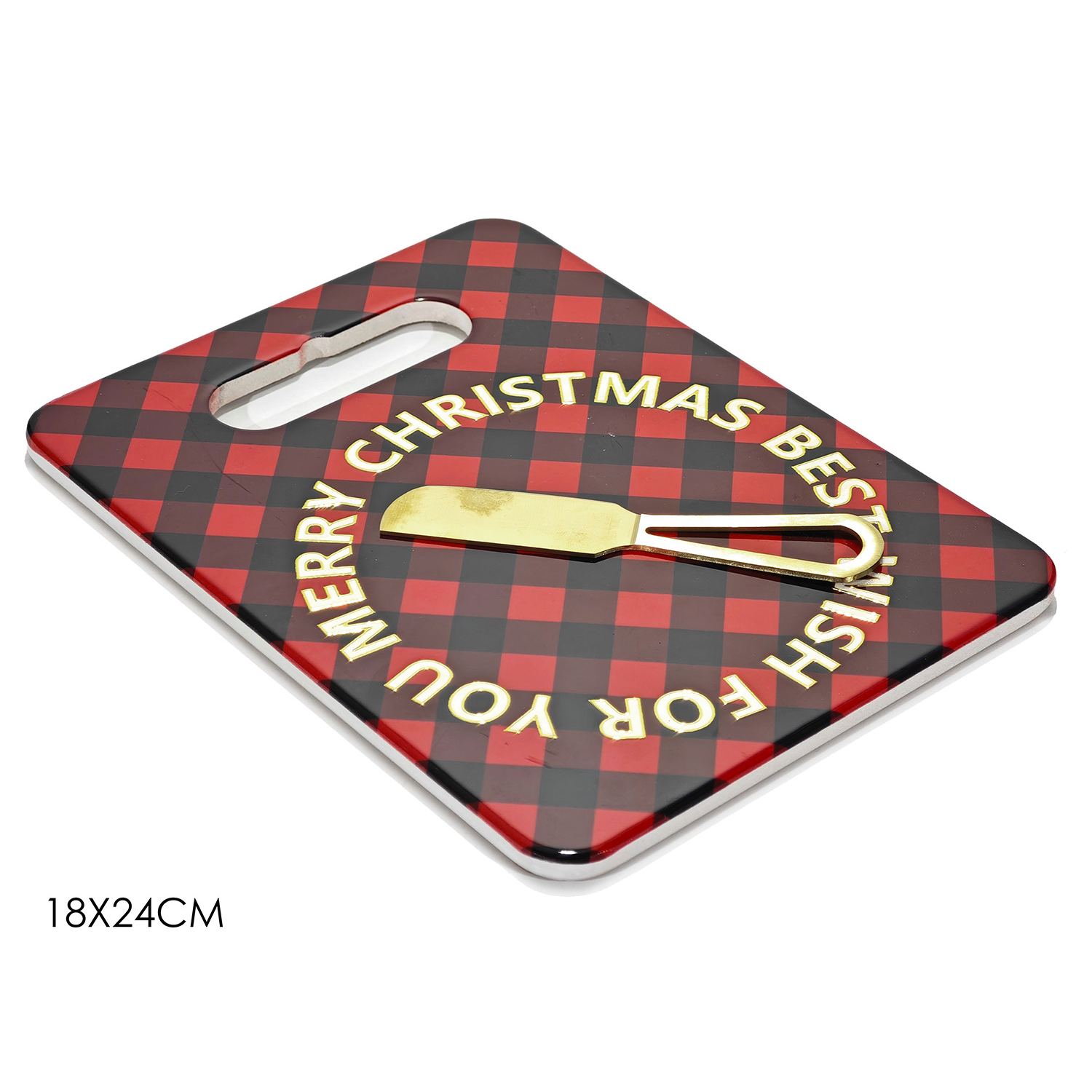 Χριστουγεννιάτιο σετ κουζίνας επιφάνεια κοπής και μαχαίρι/σπάτουλα σε καρό κόκκινο χρώμα 18x24cm