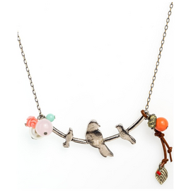 Handmade necklace in a silver tone with a long chain featuring a branch pendant with birds and coloured beads.